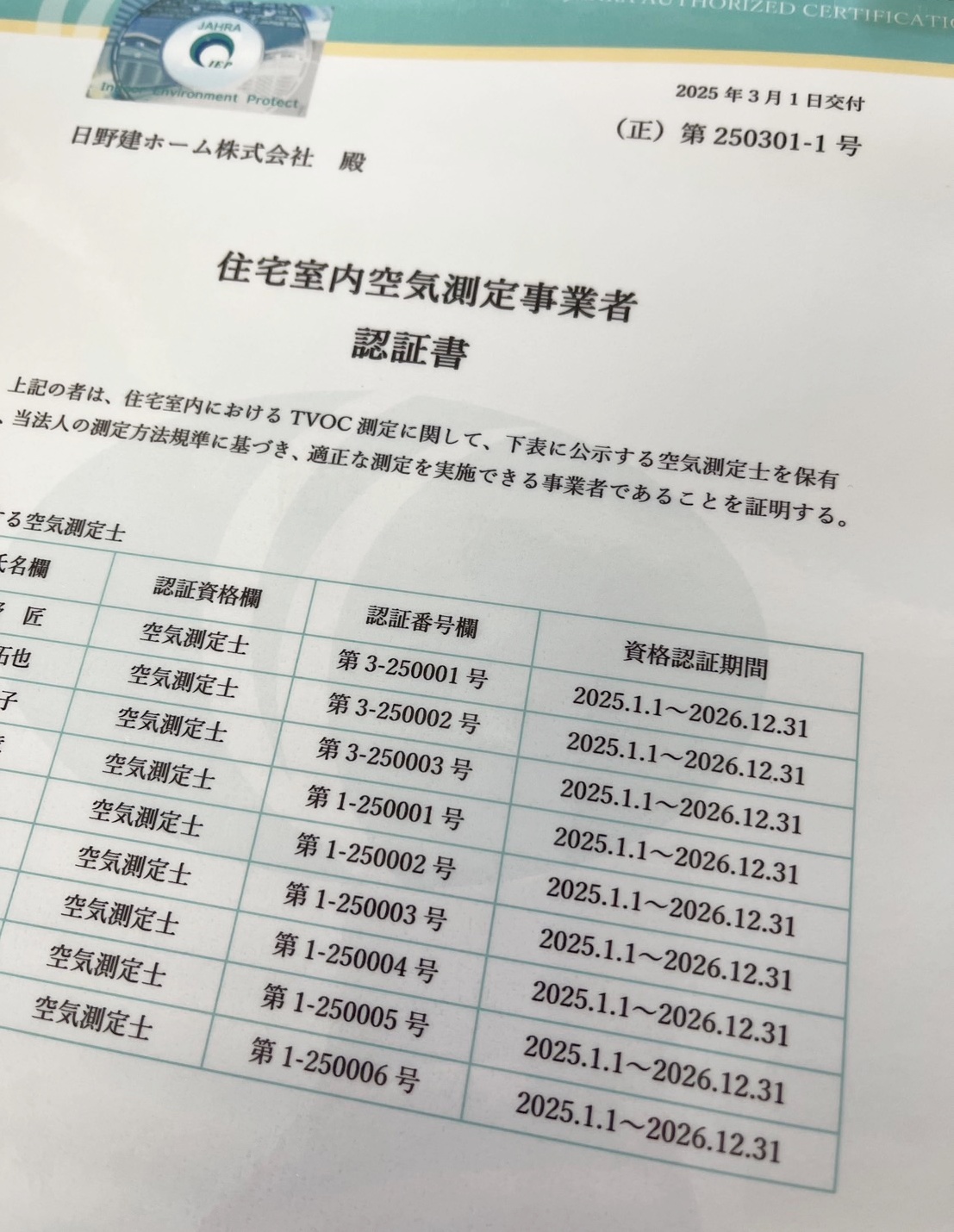 今年は、TVOC空気測定の有資格者スタッフが9名在籍となりました。