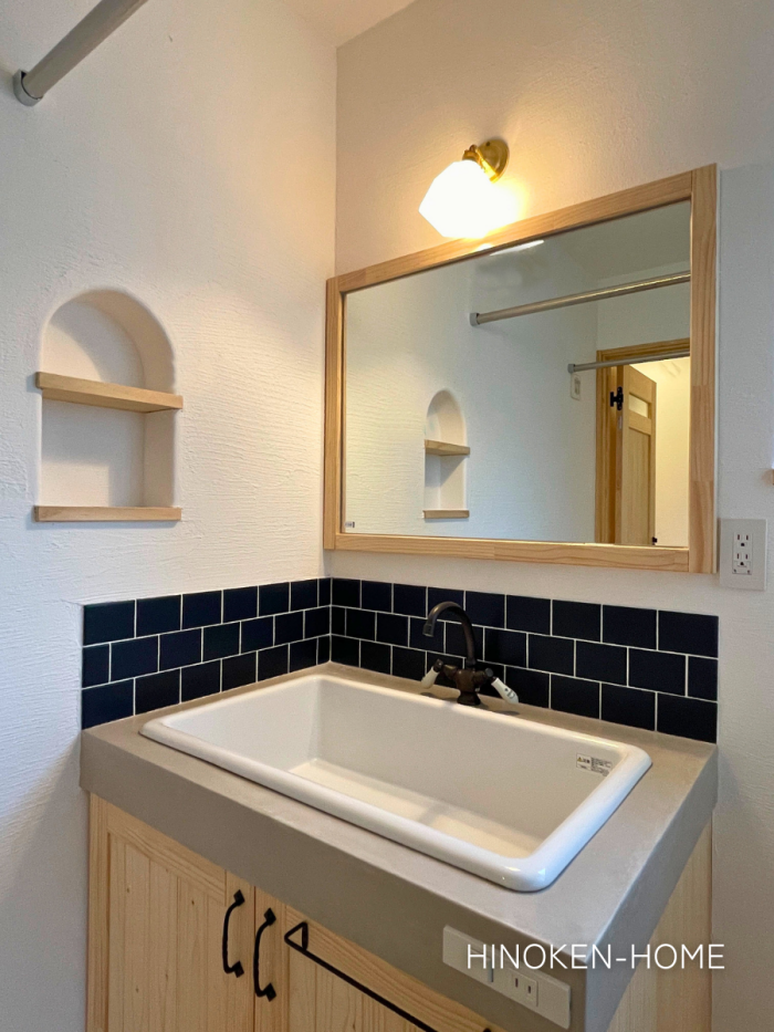 モルタル天板とタイル張りが人気の造作洗面。暮らしを楽しく彩るこだわりのポイント。