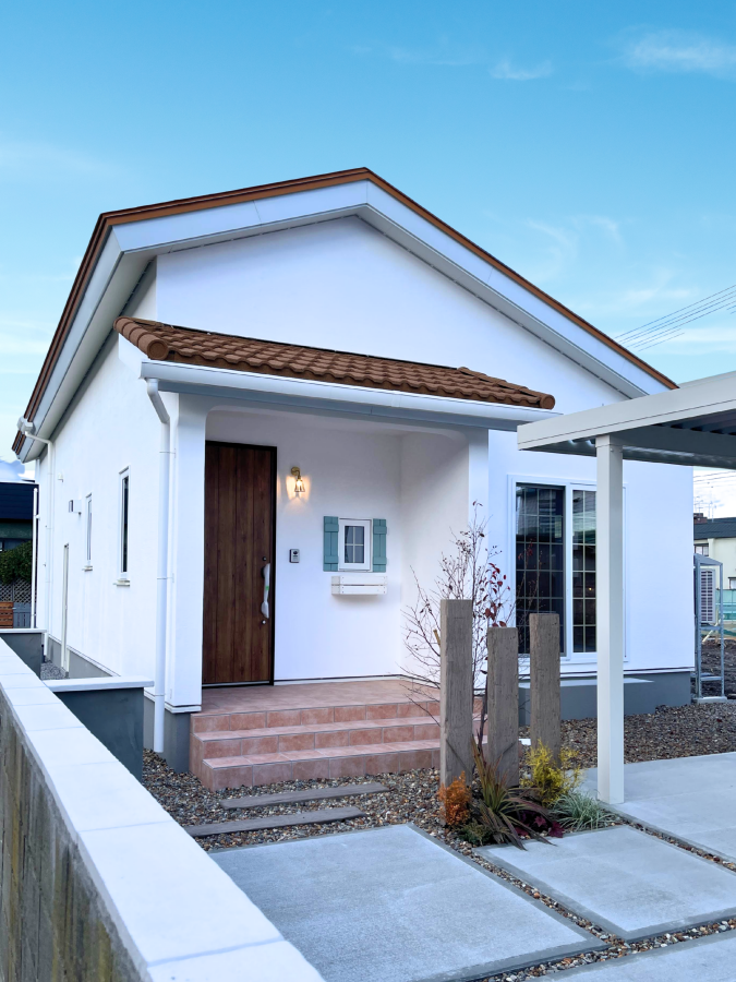 漆喰の白い壁に、あたたかみのあるオレンジ色のメイン屋根を組み合わせた平屋の外観。