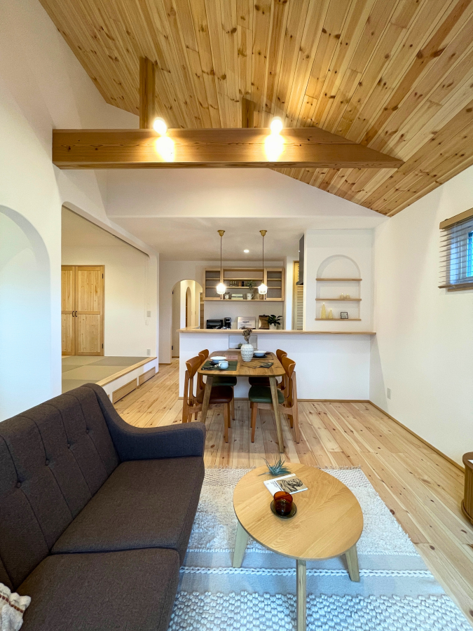 板張りの勾配天井が印象的な、開放感あふれる平屋住宅。