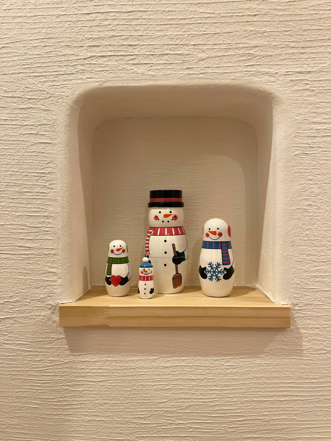 漆喰壁のやわらかな質感に囲まれたニッチは、お気に入りの雑貨や季節の小物を飾る小さなステージ。