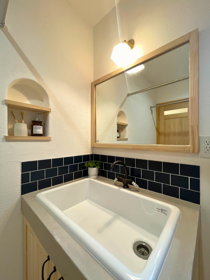 モルタル天板に、落ち着いた色合いのタイルを立ち上げた造作洗面台。