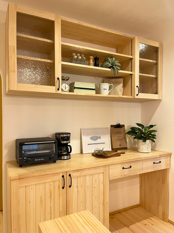 木の温もりを感じられる、日野建ホームで人気の木製カップボード。