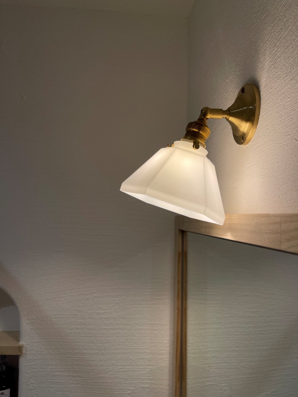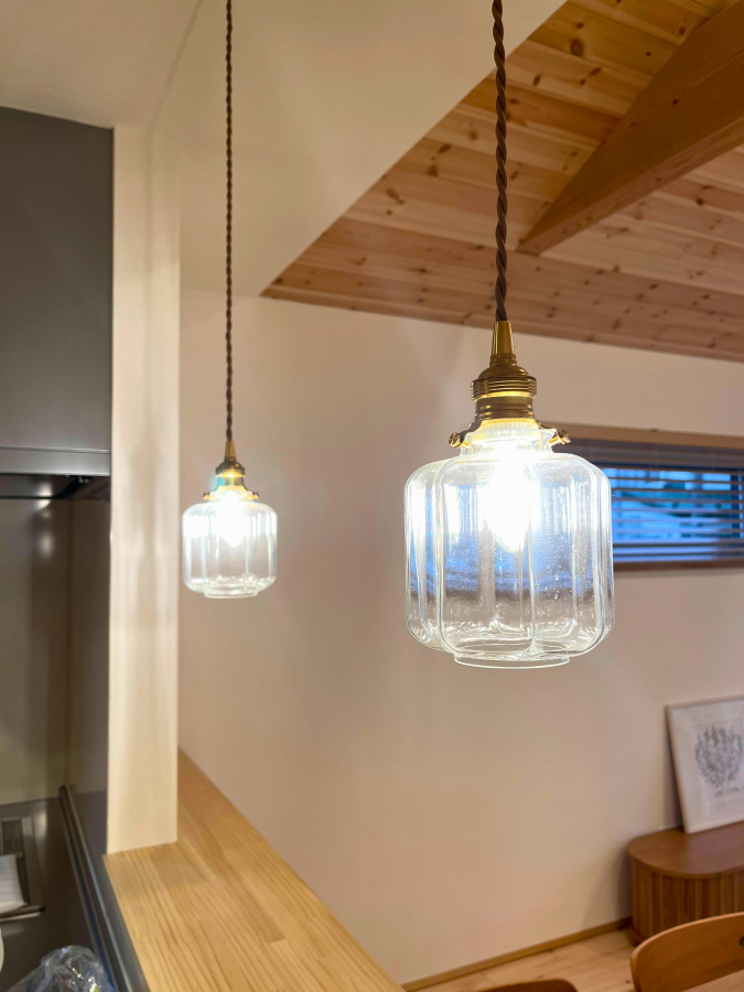ガラスシェードやミルクガラスシェードを採用し、自然素材の家にやさしくなじむ灯りを選びました。