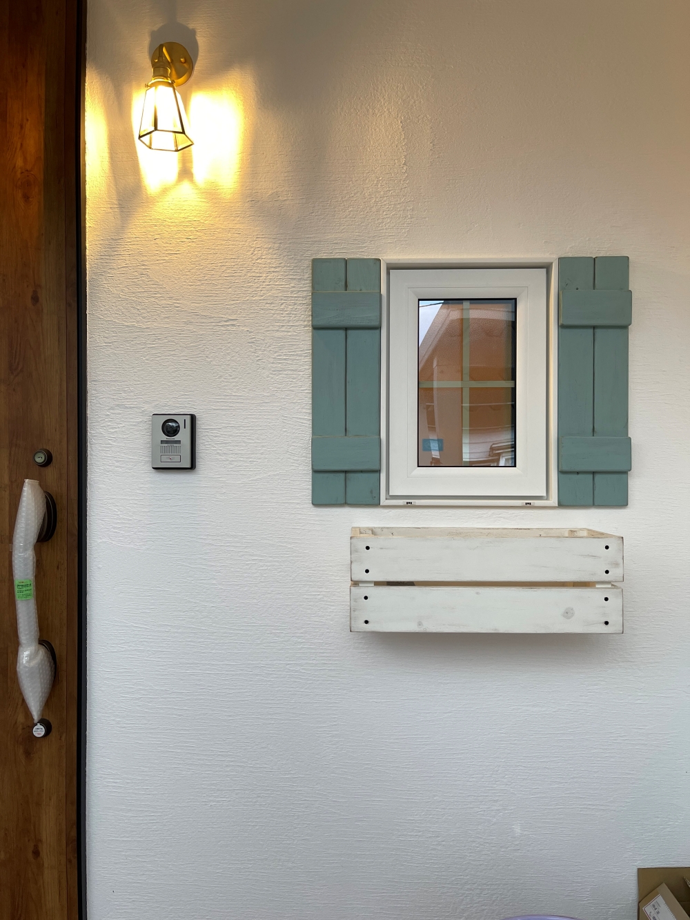 玄関ポーチに設けた、ブルーグリーンの鎧戸が印象的な外観デザイン。