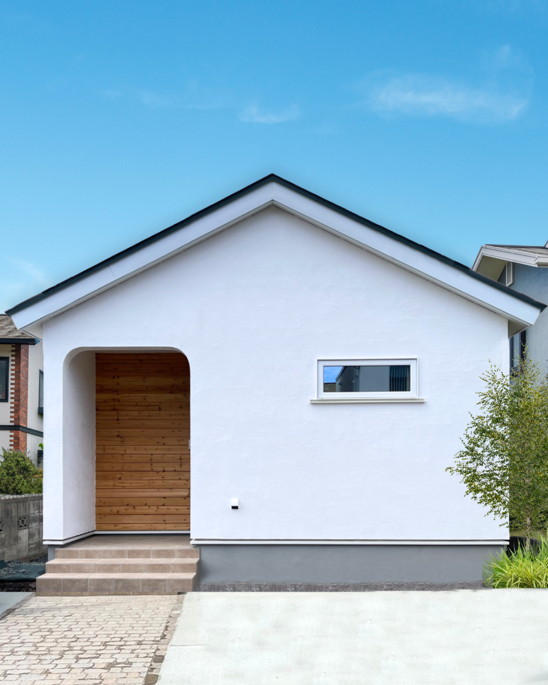 真っ白な漆喰壁に、ポーチの板張りがアクセント。