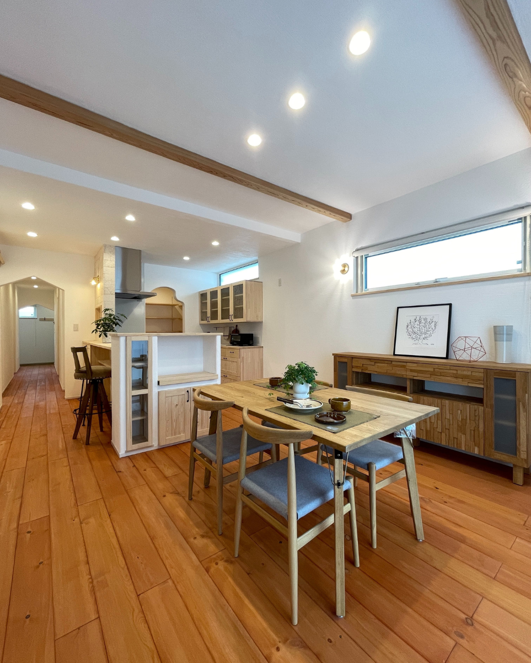 真っ白な漆喰壁に映える、梁見せ天井の温もりあるライン。