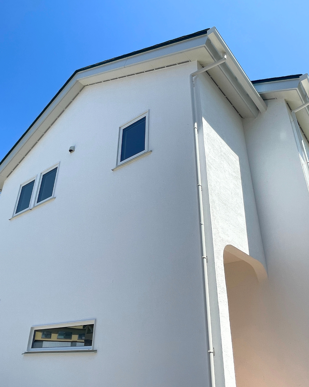 Point6 まっしろな漆喰壁と三角屋根が映える家。