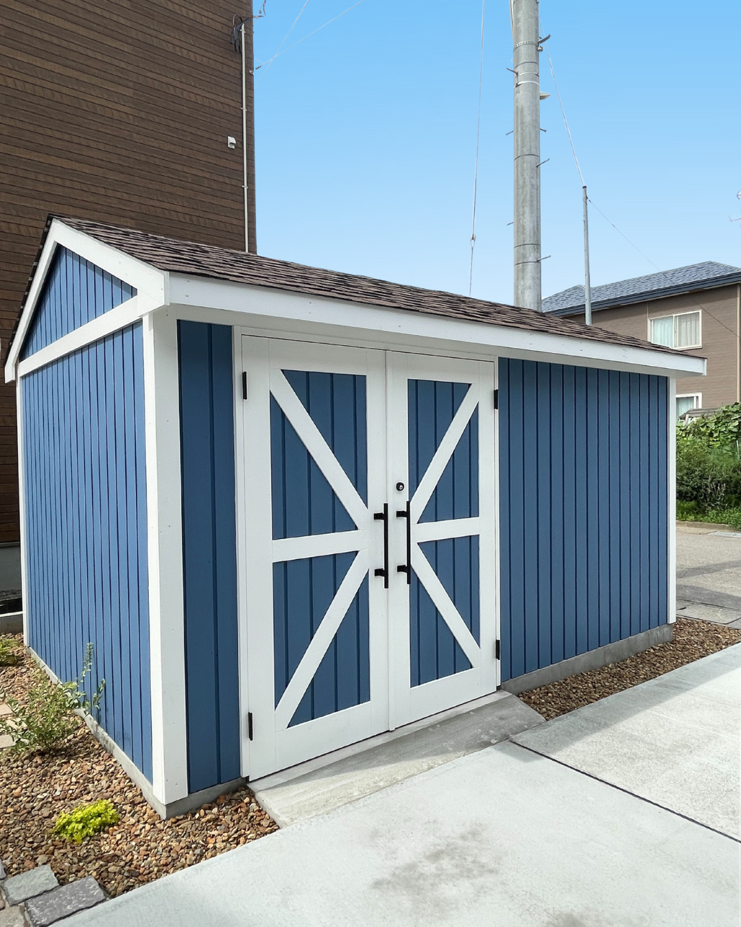 ブルーの板張りと三角屋根が最高にいい感じで、お家の雰囲気にもぴったり。