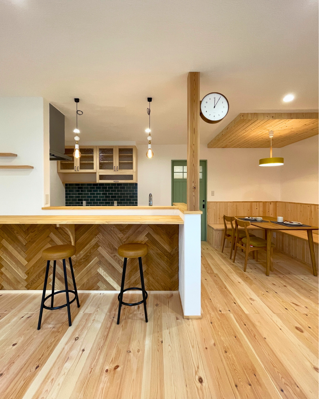 ヘリンボーンの腰壁と、柱に取り付けた両面時計がアクセント。