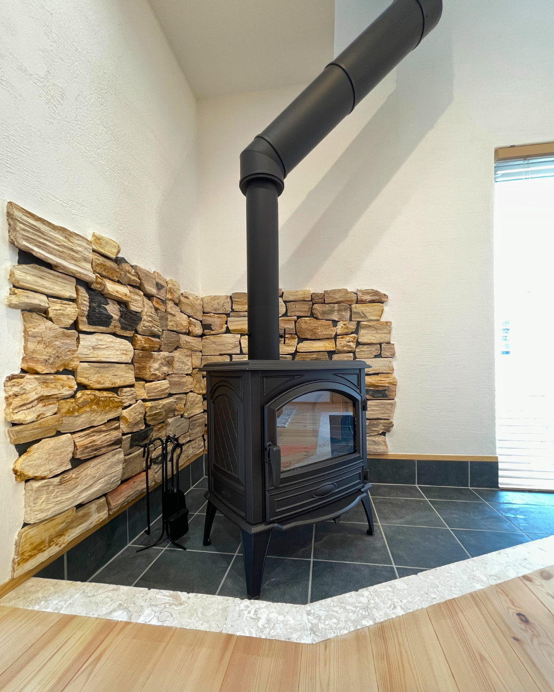 ストーブ周辺の壁面に張ったのは重厚感とラフな質感で人気の「ジュラシックウッドストーン」