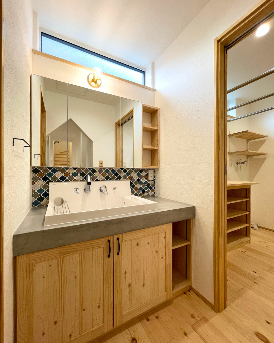 既製品のボウル・水栓による“機能性”を組み合わせた洗面化粧台。