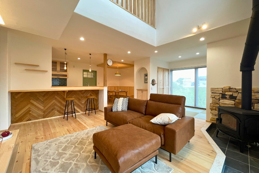 冬には薪ストーブのやわらかな炎がゆらめく吹き抜けリビング。