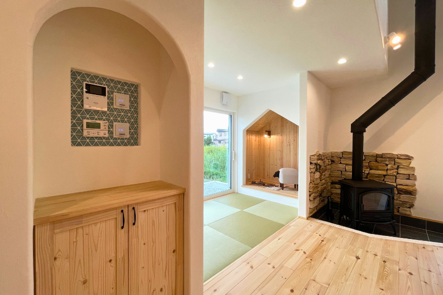 自然素材のあたたかさと、ストーブのぬくもりが重なって心も体もほっとする時間が流れます。